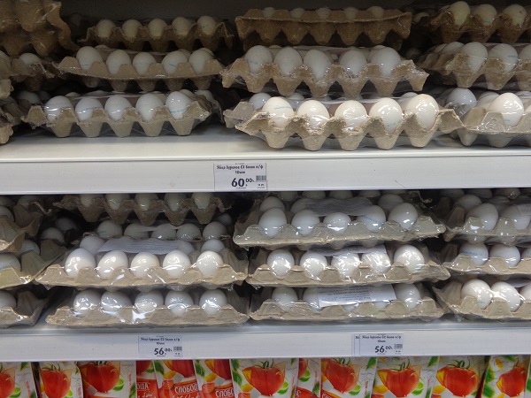 Опасения внушают не только цены на сахар, но и на такой традиционный продукт, как куриные яйца. Ещё летом в Ульяновске десяток можно было приобрести за 40-45 рублей, но кризис диктует новые цены. Наиболее дешевые «второсортные» яйца продаются теперь за 55 рублей/десяток - в «Дворцовом ряду». Однако сразу после Нового года яйца стоили дороже - 57,9 рублей минимум («Гулливер»). Сейчас же «Гулливер», как и большинство супермаркетов, снизил цену - 56 рублей за второй сорт, 60 за первый.