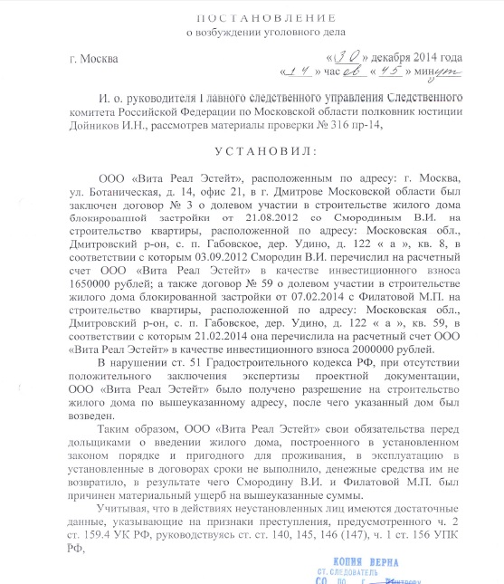 Итак, в присланных документах говорится, что из материалов проверки стало известно: компания «Вита Реал Эстейт» заключила с двумя дольщиками - Смородиным С.В. и Филатовой М.П. - договоры долевого участия на строительство дома, по которым клиенты перечислили на счета ООО средства в общей сумме 3,65 млн рублей. Однако, «в нарушении ст. 51 Градостроительного кодекса РФ, при отсутствии положительного заключения экспертизы проектной документации, 000 «Вита Реал Эстейт» было получено разрешение на строительство жилого дома по вышеуказанному адресу, после чего указанный дом был возведен. Следовательно, 000 «Вита Реал Эстейт» свои обязательства перед дольщиками о введении жилого дома, построенного в установленном законом порядке и пригодного для проживания, в эксплуатацию в установленные в договорах сроки не выполнило. Денежные средства компания им не возвратила. В результате чего Смородину и Филатовой был причинен материальный ущерб на вышеуказанные суммы», - говорится в документе.