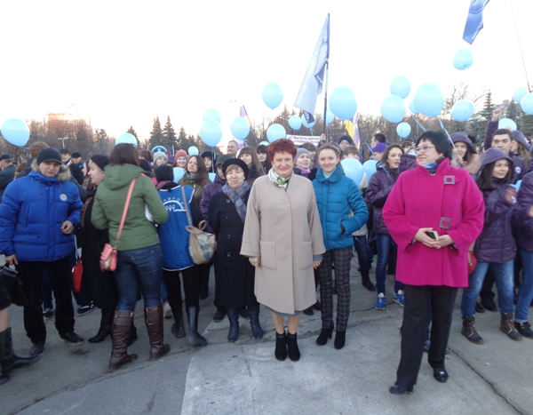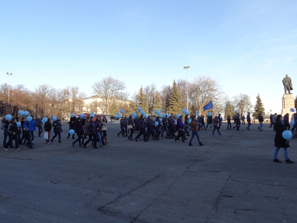 Молодёжь с голубыми шарами организованно шествует на митинг