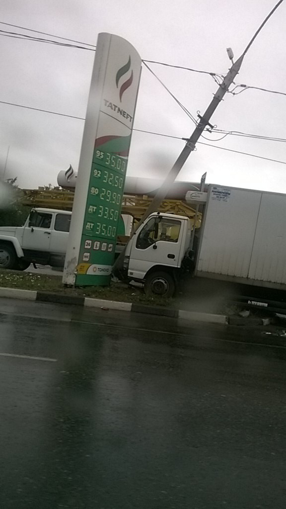В Ульяновске около получаса назад произошло ДТП. Водитель грузовика не справился с управлением, в результате чего автомобиль налетел на щит, установленный около заправки "Татнефть" на Московском шоссе.