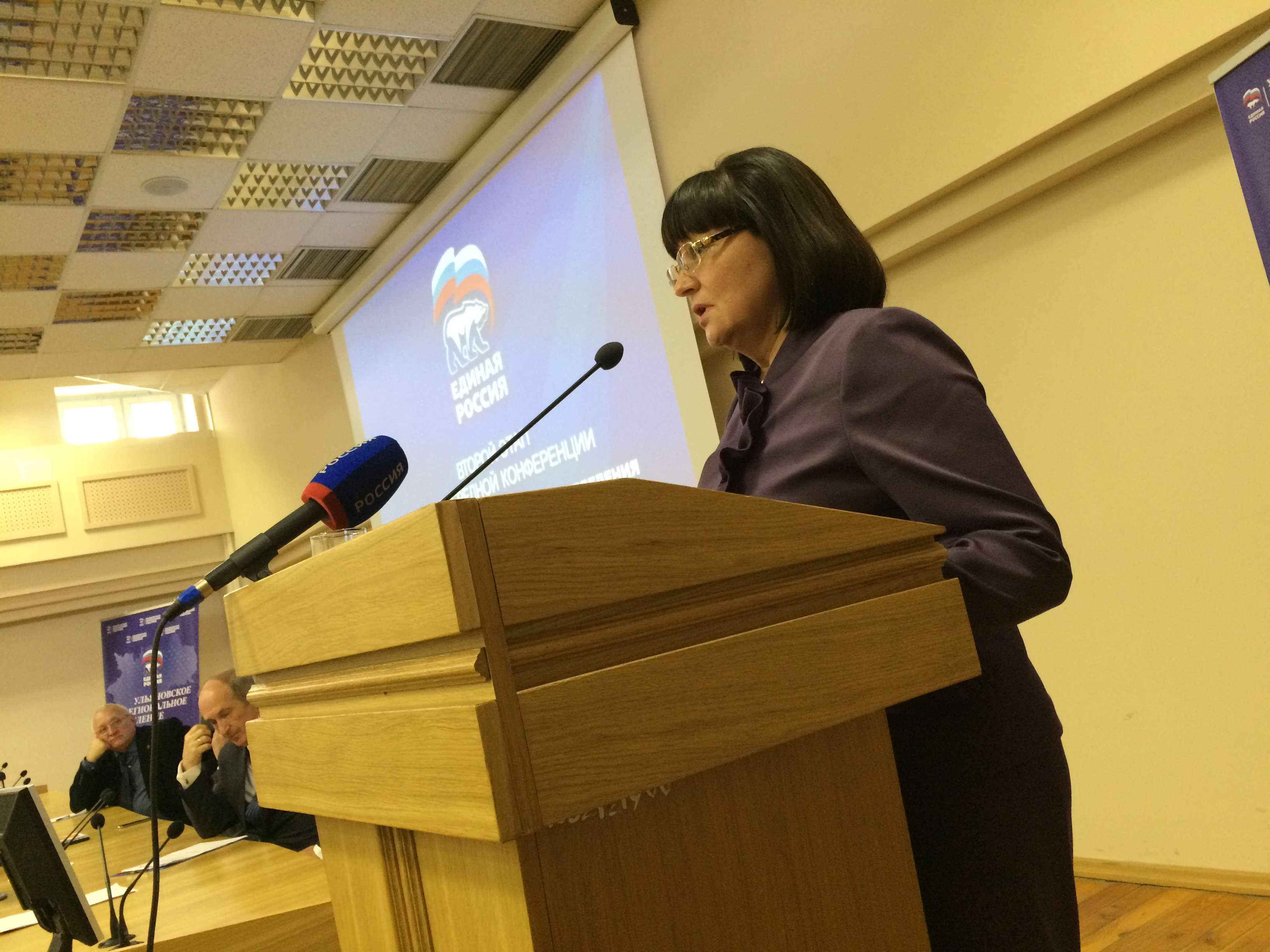 Началось выступление партийцев. В числе первых - новый депутат УГД Валентина Панова и глава Новоспасского района Александр Вражнов.
