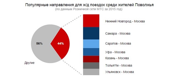Чаще всего жители Поволжья выбирали Москву своим пунктом назначения - самыми востребованными для деловых поездок и отдыха среди жителей регионов Поволжья стали направления в столицу России из Нижнего Новгорода, Самары, Саратова, Уфы и Казани. При этом, жители Уфы помимо перемещений на поездах, активно летали: направление Уфа – Москва стало самым популярным направлением для авиаперелетов в Поволжье.