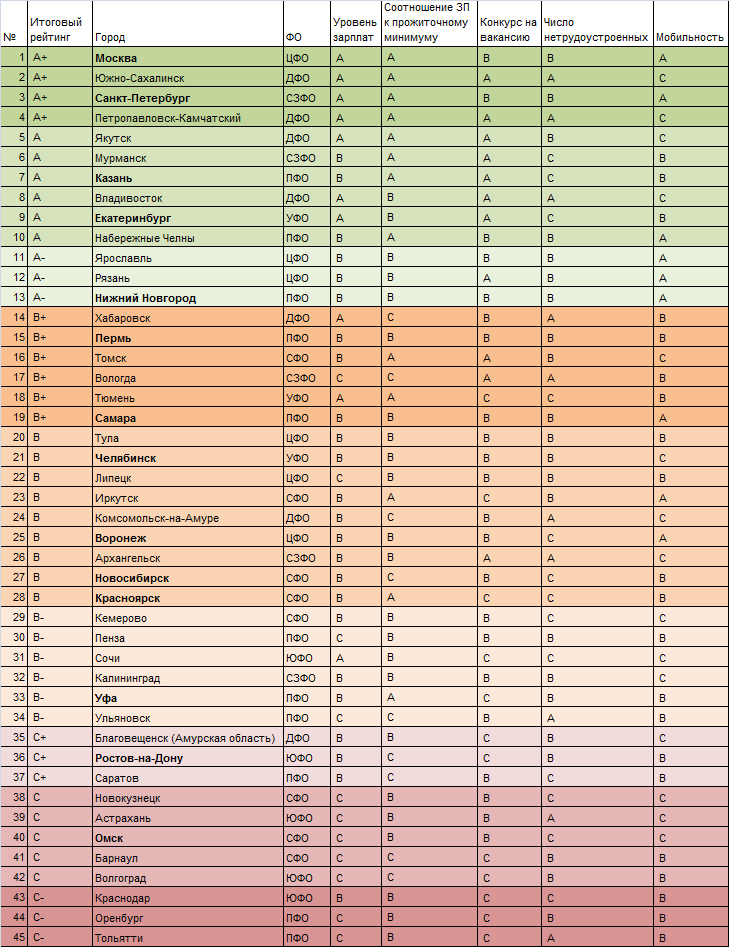 А класс - города с хорошим потенциалом для трудоустройства (высокий уровень зарплат, невысокий конкурс, низкая доля нетрудоустроенных и желающих покинуть город).