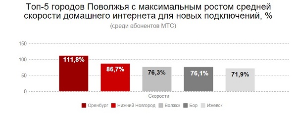 В топ-5 городов с наибольшим ростом скорости подключения вошли Оренбург, Нижний Новгород, Волжск (Республика Марий Эл), Бор (Нижегородская область) и Ижевск (Удмуртская республика). Так, в Оренбургской области средние скорости подключения выросли на 111,8 процента с 41,76 Мбит/с до 88,7 МБитс/с.
