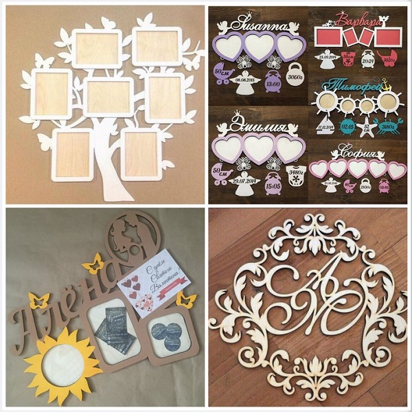 Отличным подарком на 23 февраля, 8 марта, юбилей начальника или любой семейный праздник станет изделие ручной работы из природного материала. Например, деревянная фоторамка или вензеля с именами и памятными датами.