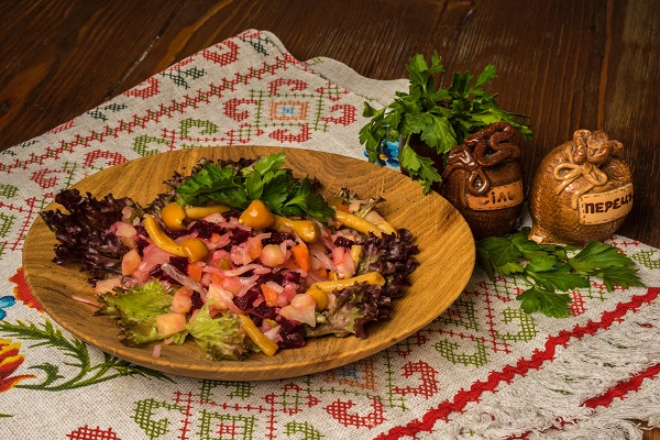 Например, салат «Винегрето из фермерских продуктов» - сочетание «зимних» овощей со свежим сочным огурчиком и хрустящей капустой.