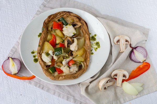 Очень вкусное и питательное блюдо - «Папский дворик» - ароматное филе трески, бережно запеченное в пергаменте с картофелем, сладким перцем, цуккини, шампиньонами и луком.