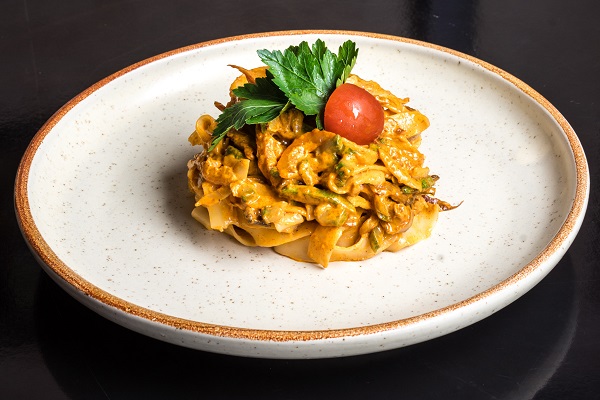 Можно попробовать и «Тестовину с зелениною» - это нежнейшая паста фетучини, с цуккини, грибами вешенка, репчатым луком, приправленная растительными сливками и сладкой паприкой.
