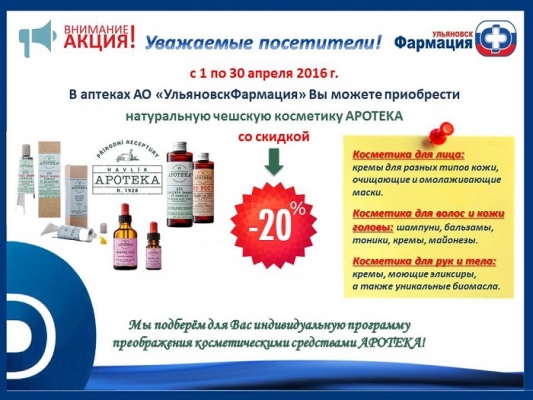 С 1 апреля до конца месяца каждому покупателю предоставляется скидка в размере 20 % на натуральную чешскую косметику APOTEKA.