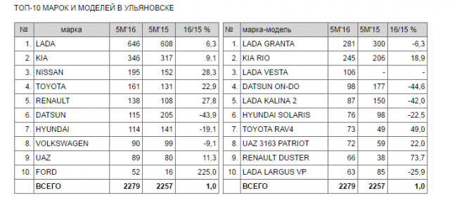 Лидер по итогам пяти месяцев 2016 года - LADA. За начало года ульяновцами было куплено 646 машин.