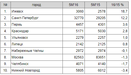 А вот у лидера рейтинга Ижевска прирост авторынка составил аж 18,7% - в городе продано 3,1 тыс. автомобилей. На втором месте по динамике - Санкт-Петербург (+12,2%; 32,8 тыс. автомобилей). В тройку лидеров вошла и Пермь (+3,6%; 4,5 тыс. шт.).