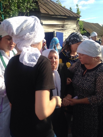 Из первых лиц региона замечена директор департамента соцзащиты правительства Ульяновской области Екатерина Сморода. По татарскому обычаю во время похорон женщины покрывают головы белыми платками: