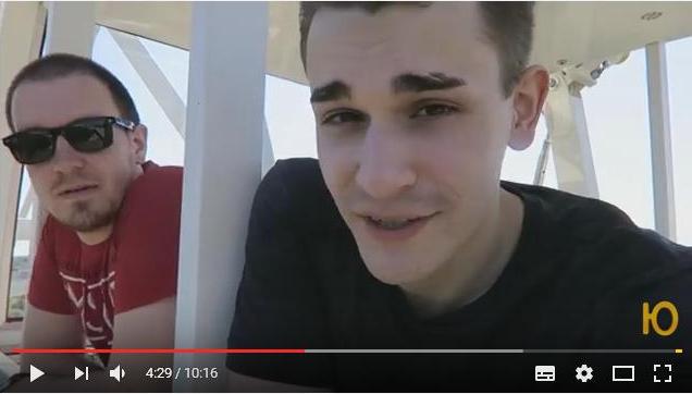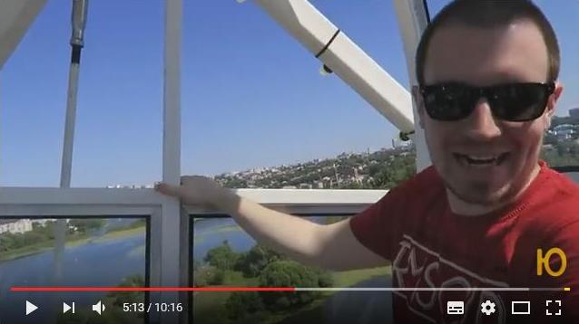 "Мы находимся на колесе обозрения. Здесь есть туалет - кабинка есть! Всем, привет, с вами Юлик и программа "Чудаки". Сейчас Артем спрыгнет с колеса обозрения. Ну подыграй для хорошего кадра! Если ты спрыгнешь, это будет твой самый лучший скетч (с англ. "набросок" - ред.)!"