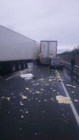 Столкновение произошло на 855 километре федеральной трассы. По словам очевидцев, в ДТП попали сразу несколько машин: три фуры, УАЗ и «Приора». Сообщается, что никто не пострадал, но из-за ДТП полностью перегорожена проезжая часть. На месте работают сотрудники ГИБДД. Предпологают, что причиной аварии могли стать погодные условия.