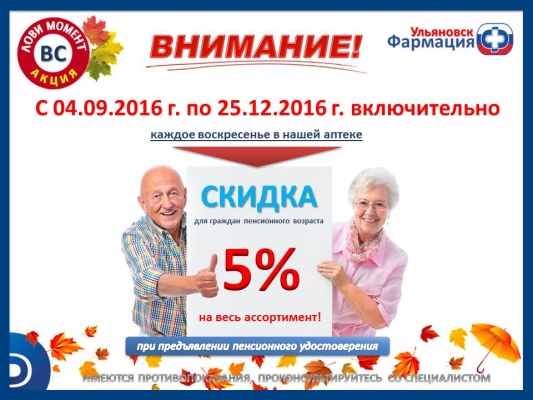 В аптеке № 135 АО «УльяновскФармация» (г. Ульяновск, ул. Пушкарёва, 48) 4 сентября стартует акция! Каждое воскресенье до конца 2016 года на весь ассортимент предоставляется скидка в размере 5% гражданам пожилого возраста при предъявлении пенсионного удостоверения.