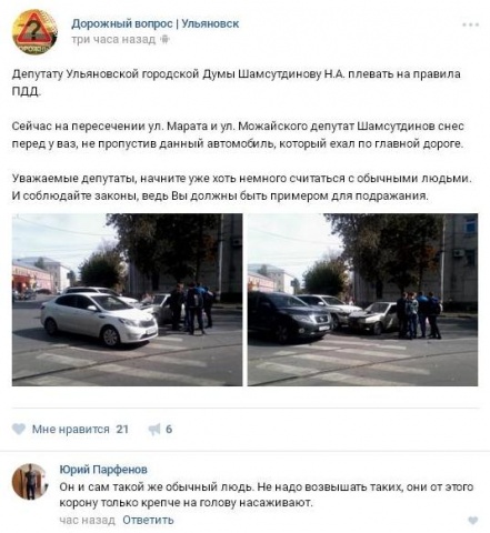По информации очевидцев, водитель белого внедорожника Toyota Highlander не уступил дорогу автомобилю марки ВАЗ-2109, в результате чего произошло столкновение. Ульяновцы предположили, что виновником ДТП стал лидер реготделения партии "Родина" в Ульяновске Назарий Шамсутдинов. Якобы, именно он является владельцем иномарки и именно его очевидцы аварии видели за рулем внедорожника.