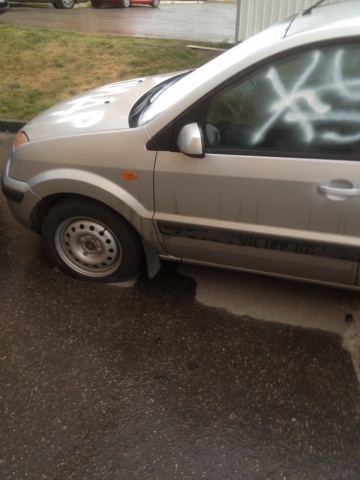 Заляпанный белой краской, исписанный нецензурными словами «Форд» с проткнутыми колесами Куринный обнаружил сегодня, 8 сентября. Видимо, хулиганы действовали ночью.