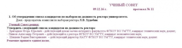 - Согласно решению ученого совета УлГТУ от 9 декабря 2016 года это будут действующий и.о. ректора УлГТУ, кандидат экономических наук Александр Пинков, действующий декан заочно-вечернего факультета УлГТУ, кандидат технических наук, доцент Игорь Бригаднов (51 год), действующий директор ИАТУУлГТУ, кандидат технических наук, доцент Вадим Шишкин (57 лет).