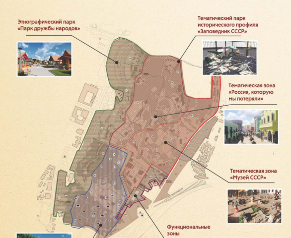 Как следует из презентации, тематический парк «Музей СССР» будет состоять из нескольких зон: этнографического парка «Дружбы народов» (расположится на 65 га парковой зоны), тематической зоны «Россия, которую мы потеряли» и из собственно «Музея СССР».