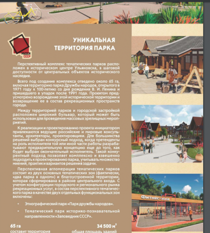 - Проект парка «Музей СССР» признан приоритетным проектом в Ульяновской области. Теперь он будет признан таковым и для Ульяновска. По сути, это формальность. Статус приоритетного позволит инвестору рассчитывать на льготное налогообложение – 0% налога на землю. Инвестиции в проект составят 767 млн рублей. Софинансирования из бюджета не предполагается. Крайний срок реализации проекта – конец 2018 года, - прокомментировал замначальника управления по развитию предпринимательства Александр Алексеев.