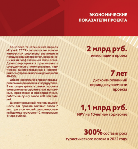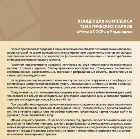 На финальных страницах презентации делаются выводы, что создание парка СССР позволит к 2020 году на 300% увеличить туристический поток региона.