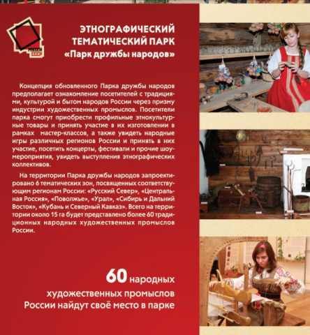 По задумке инвестора, существующий парк Дружбы народов должен будет превратиться в этнографический парк, где «будут представлены 60 видов народных ремесел». По сути, парковая зона превратится в традиционный «город мастеров». Такие существуют в нескольких регионах страны.
