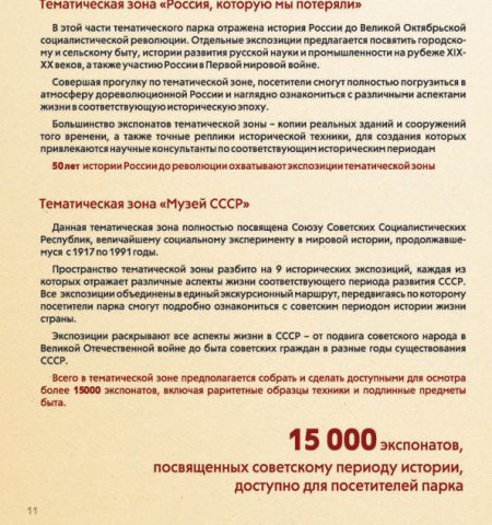 А вот сам «Музей СССР» будет содержать «9 экспозиций, которые будут отражать разные аспекты жизни соответствующего периода развития СССР». Какие именно это периоды – не указано. Но зато отмечается, что музей будет содержать 15000 экспонатов.