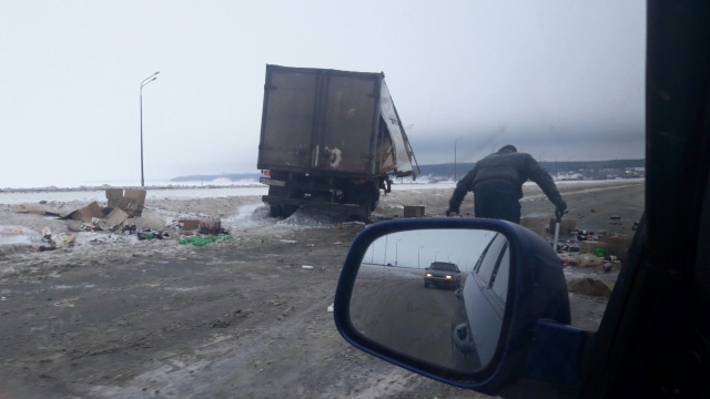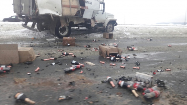 Примерно в 11:00 там столкнулись два автомобиля - Kia «Rio» и грузовик. Последний, по всей видимости, перевозил алкоголь, поскольку на фото четко видны разлетевшиеся в разные стороны бутылки шампанского. Подробности и причины ДТП выясняются, информации о пострадавших пока нет.