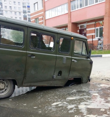 Вчера вечером, 4 июня, в соцсетях ульяновцы выложили фотографию, на которой показано, как УАЗ провалился под асфальт на улице Аблукова.