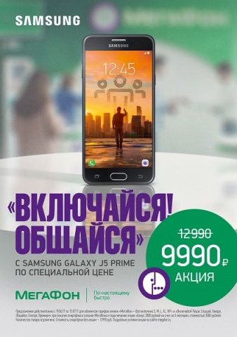 Samsung J5 Prime можно приобрести в интернет-магазине «МегаФона» по специальной цене 9990 рублей, что на 3000 рублей меньше средней стоимости по рынку*. Условия получения специальной цены: