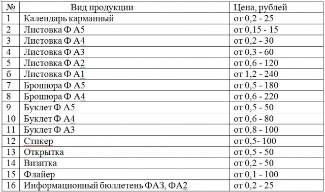 Услуги по изготовлению печатной агитационной продукции по следующим расценкам: