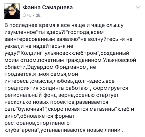 - После смерти отца было очень много разговоров. Многие почему-то считали, что я не стану заниматься его бизнесом, хотя уже десять лет работаю в холдинге. Ради общего дела я ушла из медицины. Это было желание моего отца - он хотел успеть научить меня тому, что умел, за то время пока мог. Чтобы положить конец всем слухам, разговорам и недомолвкам была вынуждена опубликовать пост в Фэйсбуке. Бизнес не продается, ни с кем не ведется переговоров. Это дело, которым много лет занимался мой отец, создал холдинг, вывел бизнес на новый уровень, на новые объемы. Эдуард Ефимович создал торговую сеть и полный замкнутый цикл производства муки, достроил элеватор и мельницы... Не брошу этот бизнес потому, что я такой бульдог немного по натуре - если укусила в «замок», то уже ни за что не брошу.