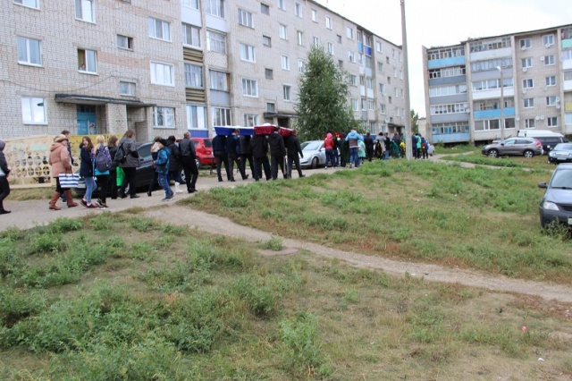 Из двора советской пятиэтажки траурная кавалькада движется к криушской церкви. Из Ульяновска приехало очень много друзей ребят - автомобилей в колонне не меньше сотни. Храм - рядом со школой, в которой училась Юля. Другая ученица этой школы Катя говорит, что фотография Юли с первых лет висела на доске почета, и она обязательно получила бы золотую медаль, если бы осталась после 9 класса.
