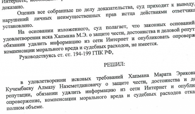 Юристы главного врача областной станции переливания крови Марата Хапмана проиграли в суде мастеру правовых разборок Алмазу Кучембаеву. Хапман намерен обжаловать решение. Поводом к судебному спору стала публикация в соцсети.