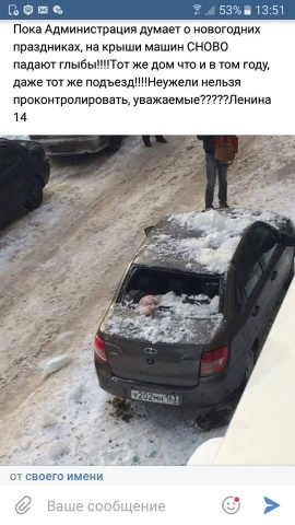 В «Активном обществе Димитровграда и области» сообщили о том, что по адресу Ленина 14 серьезно пострадала Лада Гранта. Причем, ЧП произошло ровно на том же месте, где в прошлом году ледяная глыба упала на голову молодому парню.