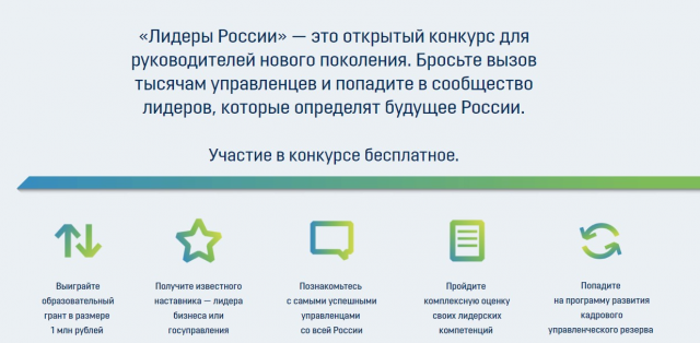 «Бросьте вызов тысячам управленцев и попадите в сообщество лидеров, которые определят будущее России». Такой призыв на главной странице конкурса «Лидеры России», который обещает его участникам не только развитие лидерских способностей, но и 1000000 рублей на обучение, консультации от топ-менеджеров крупнейших компаний и выдающихся государственных деятелей. Однако для этого участникам необходимо было пройти непростые отборочные тесты не только на определение лидерских качеств, но знание литературы, истории, математики, логики и других наук. Из Ульяновского региона в финал так никто и не прошел.