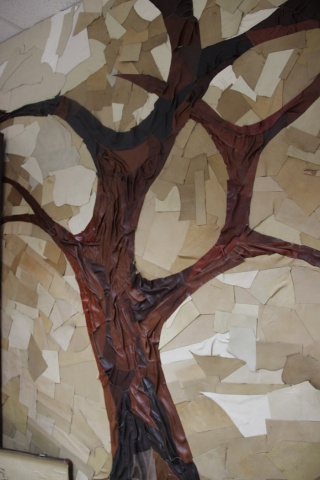 Одна из стен в офисе украшена вот таким деревом, выложенным из лоскутов кожи.