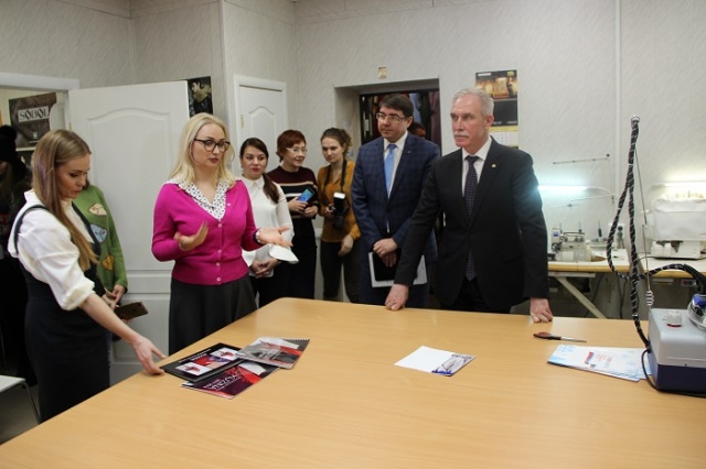 В кожевенной мастерской «Знаки» (ООО «Бюро подарков»), казалось, сами стены источали бодрящий аромат клея. У входа гостей встречала директор Юлия Емелина, которая явно смущалась, но старалась держать лицо. В производственных помещения женщины в нарядных платьях (не встречать же губернатора в робах, в самом деле) умело орудовали молотками и работали на станках.