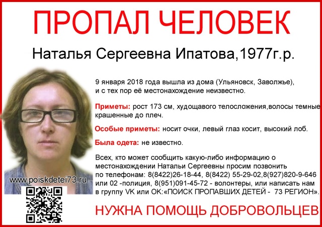 Волонтеры просят помочь в розыске 40-летней Натальи Ипатовой. Она 9 января ушла из дома в Заволжском районе и до сих пор не вернулась.