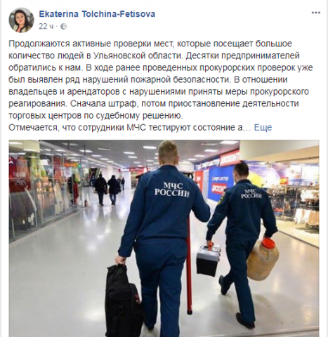 Накануне ульяновский бизнес-омбудсмен Екатерина Толчина рассказала на своей странице в соцсети о десятках бизнесменов, которые обратились к ней по итогам проверок: «В ходе ранее проведенных прокурорских проверок уже был выявлен ряд нарушений пожарной безопасности. В отношении владельцев и арендаторов с нарушениями приняты меры прокурорского реагирования. Сначала штраф, потом приостановление деятельности торговых центров по судебному решению. Сегодня обратился собственник торгового центра, в котором работает более 100 предпринимателей и его закрытие приведёт к потере прибыли, рабочих мест, налогов. Нарушения устранимы. На это требуется несколько дней. Нужно ли в этой ситуации прокуратуре обращаться в суд с приостановкой деятельности центра? Разумнее на мой взгляд, установить время для устранения нарушений и только после этого срока, обращаться в суд».